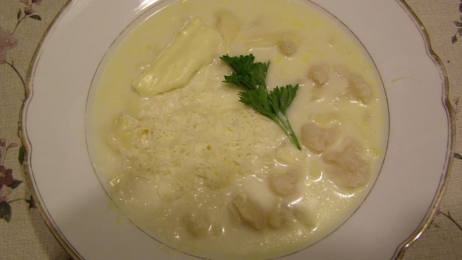 Bílá polévka s květákem, dvěma druhy sýrů a domácími nudlemi