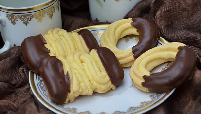 Krok 2: V hrnci nad párou nebo mikrovlnné troubě rozehřejeme čokoládu s tukem. Jakmile je cukroví upečené a vychladlé, můžeme buď spojovat marmeládou nebo jen namáčet konce v čokoládové polevě.