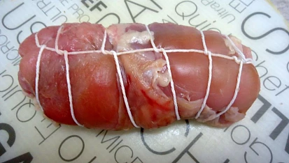 Z očištěného masa uděláme plát a lehce naklepeme přes fólii. Na plát masa klademe šunku