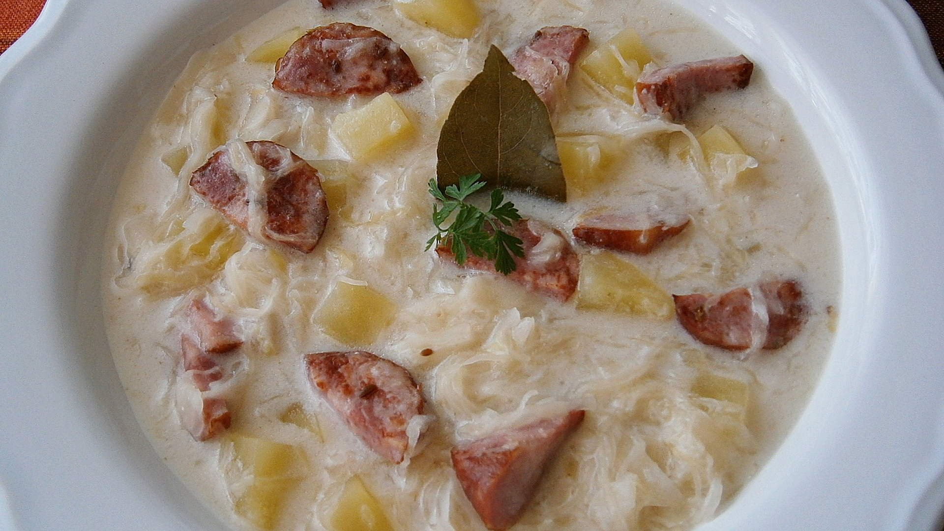 Krok 5: Hotovou polévku po dovaření zjemněte zakysanou smetanou, kterou v hrnci jen promíchejte a již nevařte. Dle kyselosti zelí můžete polévku i dosladit.