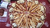 Krok 3: Vykynuté těsto rozdělíme na dva díly. Na pomoučeném vále vyválíme velkou placku tak, aby těsto nebylo silné. Placku rozkrájíme na 12 dílů.