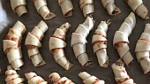 Zarolujeme do tvaru rohlíku. Necháme kynout 20 minut na plechu vyloženém pečicím papírem. Krok 5: Troubu rozehřejeme na 200 °C. Před vložením do trouby každý kousek pomažeme rozmíchaným žloutkem s jogurtem. Pečeme 30 minut.