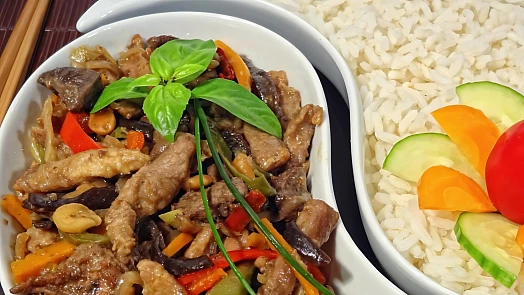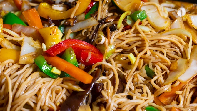 Podle potřeby přilijeme trochu oleje, vsypeme česnek a zázvor, restujeme cca 30 s, přidáme cibuli, mrkev, zelí a bílou část jarní cibulky, restujeme 2-3 min, přihodíme papriku, houby, bambusové výhonky a restujeme další 2-3 min. Krok 5: Vrátíme do pánve maso, vsypeme nudle, vlijeme omáčku a prohazujeme (nebo mícháme), dokud se se vše hezky neobalí v omáčce. Ná závěr přidáme zelenou část jarní cibulky, párkrát prohodíme a servírujeme.