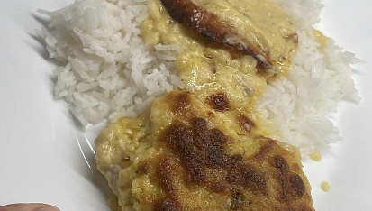 Krok 3: Uvaříme rýži, až bude maso s omáčkou hotové (na povrchu opečené do zlatova), podáváme.