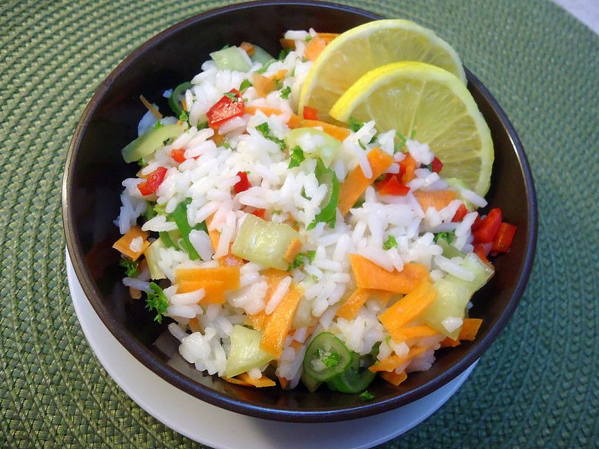 Krok 2: Všechnu zeleninu očistíme, omyjeme a nakrájíme nadrobno. Zeleninu přidáme k rýži, zakápneme citronem, přidáme špetku cukru, soli, pepř a olej.