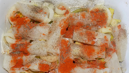 Krok 3: Na pór uložíme plátky filé, osolíme, posypeme paprikou, soľou a korením.