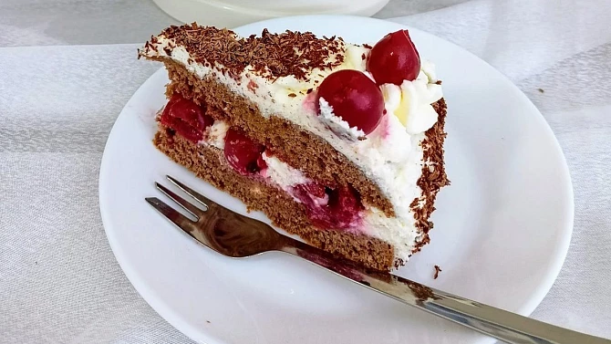 Šťávu z kompotu prošleháme se solamylem a za stálého míchání svaříme. Krok 4: Krém dáme do zdobícího sáčku a na jeden korpus nastříkáme kruhy, ale necháme mezi nimi mezery. Do mezer naneseme sáčkem višňový gel a na něj poskládáme višně. Krok 5: Přiklopíme druhou polovinou korpusu a povrch i strany potřeme krémem. Posypeme nastrouhanou čokoládou. Ozdobíme pusinkami krému a višněmi.