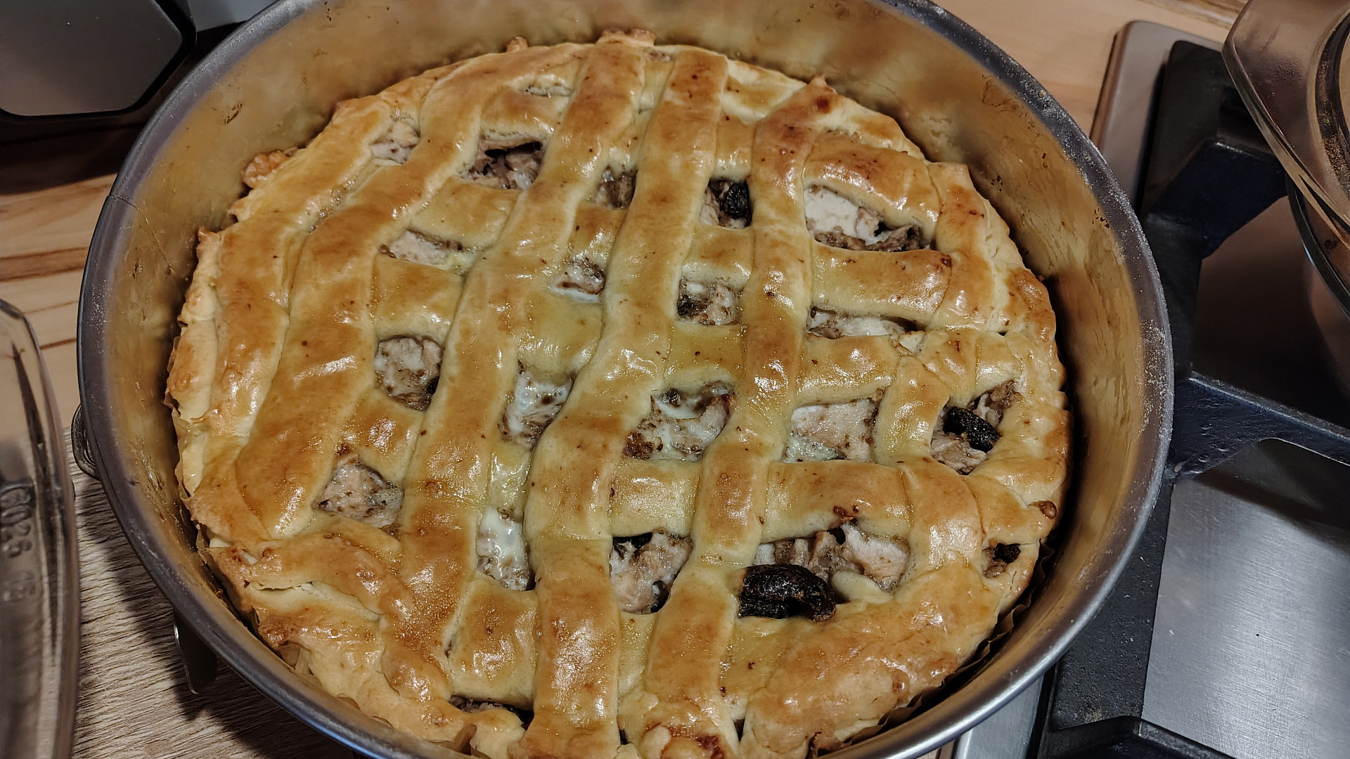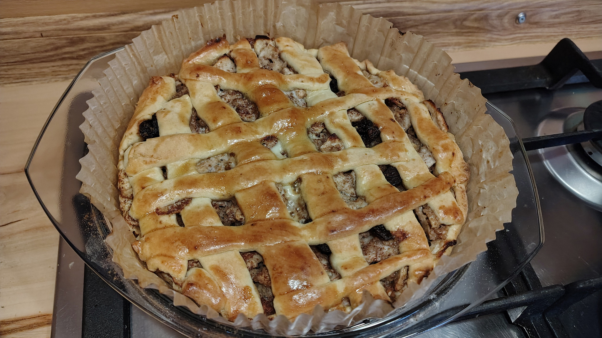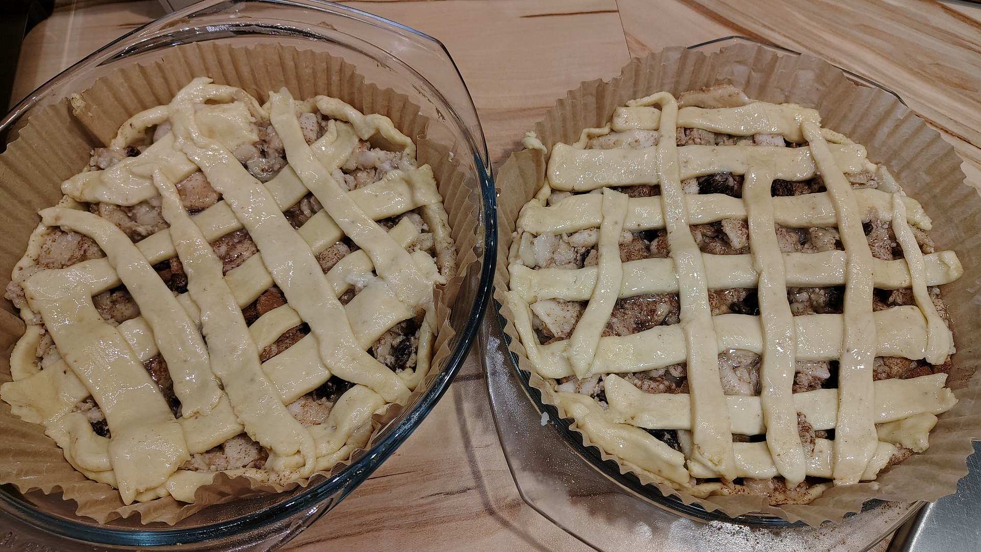 Linecký koláč s jablkovou náplní potřený bílkem.