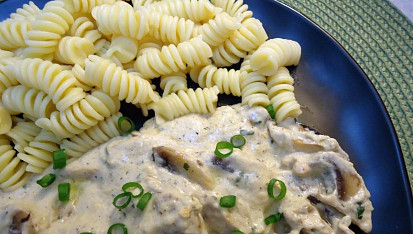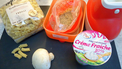než očistíme a na klínky nakrájíme žampiony. Ty do pánve k masu přidáme a poté opečeme společně vše dozlatova. Krok 2: Směs v pánvi podlijeme vývarem, přidáme mleté sušené houby (nebo houbové koření koupené) a na sníženém stupni tepla dusíme do změknutí masa. Podle potřeby podlijeme, osolíme a okořeníme pepřem a tymiánem. Krok 3: Přidáme sýry a za stálého míchání je necháme rozpustit, poté přidáme smetanu a povaříme do potřebné hustoty. Nakonec vmícháme nasekané bylinky a podáváme s těstovinami uvařenými dle návodu na obalu.