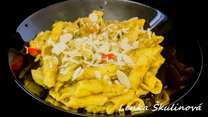 Krok 1: Penne těstoviny uvaříme dle návodu v osolené vodě. Na oleji oprahneme mandlové plátky dozlatova a dáme stranou. Olej necháme na pánvi. Krok 2: Mezitím si v horké vodě povaříme (jen trochu ne úplně doměkka) brokolicové růžičky, scedíme a nakrájíme je na malé kousky. Feferonky nakrájíme nadrobno, papriky na menší kostky. Krok 3: Poté na oleji od mandlí trochu osmahneme česnek, papriky, brokolici a feferonky, podlijeme vývarem, osolíme, opepříme a podusíme na 2-3 minuty. Přidáme pesto a restujeme trochu do zlatavé barvy. Krok 4: Nakonec promícháme v pánvi s těstovinami a mandlemi, můžeme případně ještě dosolit a opepřit dle vlastní chuti. Podávala jsem ještě posypané strouhaným sýrem.