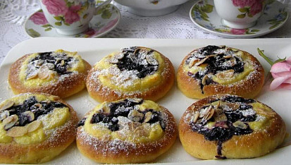 Vykynuté těsto vyklopíme na pomoučený vál a rozdělíme na 20 stejně velkých kousků. Každý zpracujeme do kuličky a poklademe na plech s pečícím papírem. Vytvarujeme koláčky a okraje potřeme rozšlehaným vajíčkem. Krok 3: Tvaroh, cukr, žloutky a citronovou kůru promícháme, naplníme zdobící sáček a naplníme koláčky. Pak na každý koláček dáme borůvky a mandlové lupínky. Krok 4: Vložíme do předem vyhřáté trouby a pečeme na 190 st. dozlatova. Horké koláčky potřeme rozpuštěným máslem s rumem.