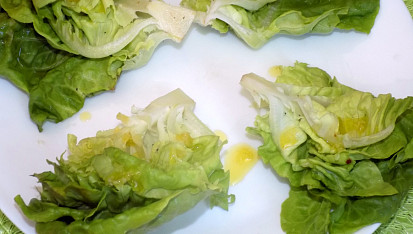 Krok 1: Hlávkový šalát nakrájame na niekoľko častí a dáme na tanier. Pokvapkáme olivovým olejom.
