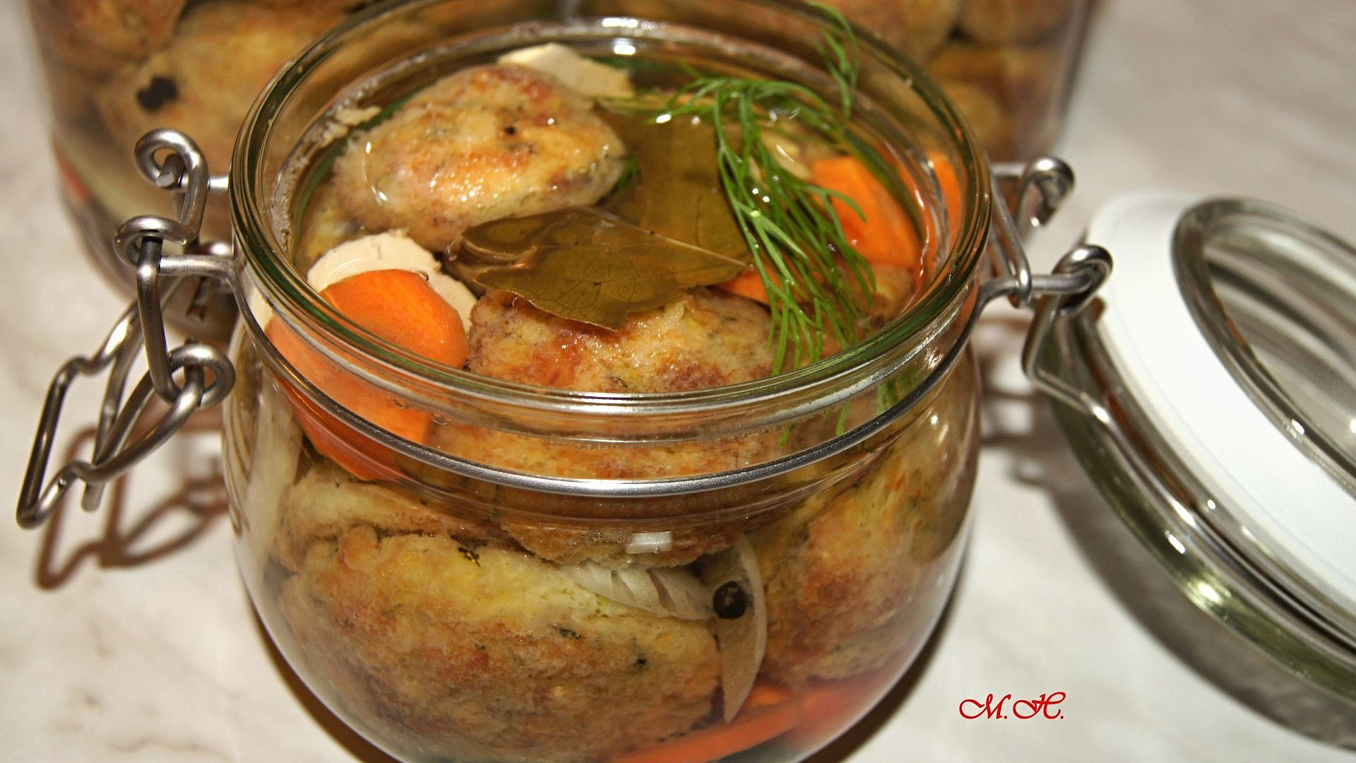Nálev odstavíme a necháme vychladnout. Krok 4: Z nastrouhané cukety vymačkáme co nejvíce tekutiny a přendáme ji do mísy. Uvařenou tresku nasekáme na malé kousky a přidáme ji k cuketě. Balkánský sýr nastrouháme a společně s rozklepnutým vajíčkem přidáme do mísy k cuketě a tresce. Pro zvýraznění chuti přidáme výše uvedené koření, samozřejmě každý podle své volby. Krok 5: 60 g strouhanky smícháme společně se 2 lžícemi hladké mouky a 2 lžícemi Solamylu. Směs postupně zapracujeme s cuketou, treskou, vajíčkem, kořením a balkánským sýrem do těsta na pečenáče. Ochutnáme, zda je hmota na pečenáče dost pikantní a osolená. Chuť nesmí být mdlá. Krok 6: Připravíme si plech, na který položíme papír na pečení. Navlhčenýma rukama odebíráme kousky těsta (asi množství 1 polévkové lžíce) a tvoříme v dlaních kuličky velikosti 3-4 cm. Kuličky obalíme ve strouhance. Obalené kuličky skládáme na papír na pečení. Krok 7: Plech vložíme do trouby vyhřáté na 200 °C a pečeme 50 minut. Posledních 10 minut jsem ještě nastavila ventilaci. Upečené kuličky necháme vychladnout Krok 8: Do každé sklenice přidáme kolečka mrkve, křenu, cibule a větvičky kopru a šalvěje. Vychladlé kuličky (no spíš tvarem vypadají jako kokosky) vyskládáme do sklenic a zalijeme je připraveným vychlazeným lákem. Sklenice uzavřeme a uložíme je do ledničky.