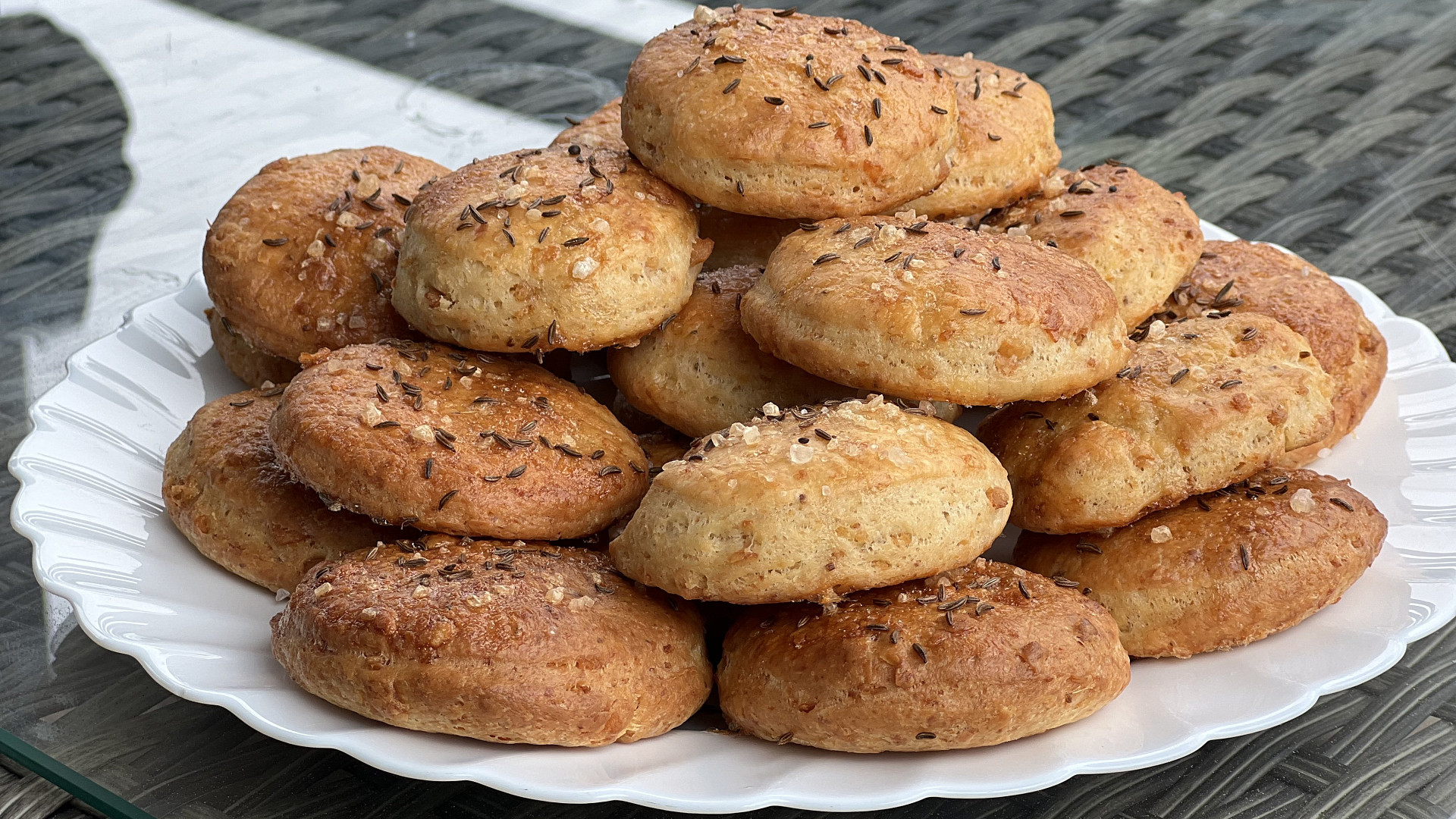 Škvarkové placky výborně chutnají jako drobné slané mlsání k pivu či vínu. Na povrchu jsou křupavé se zlatavou kůrčičkou a uvnitř se skrývá nadýchaná střídka s kousky škvarků. Před pečením je nezapomeňte potřít bílkem a posypat kmínem a solí.