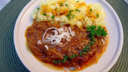 Segedínský guláš z plecka s uzenou paprikou a zakysanou smetanou