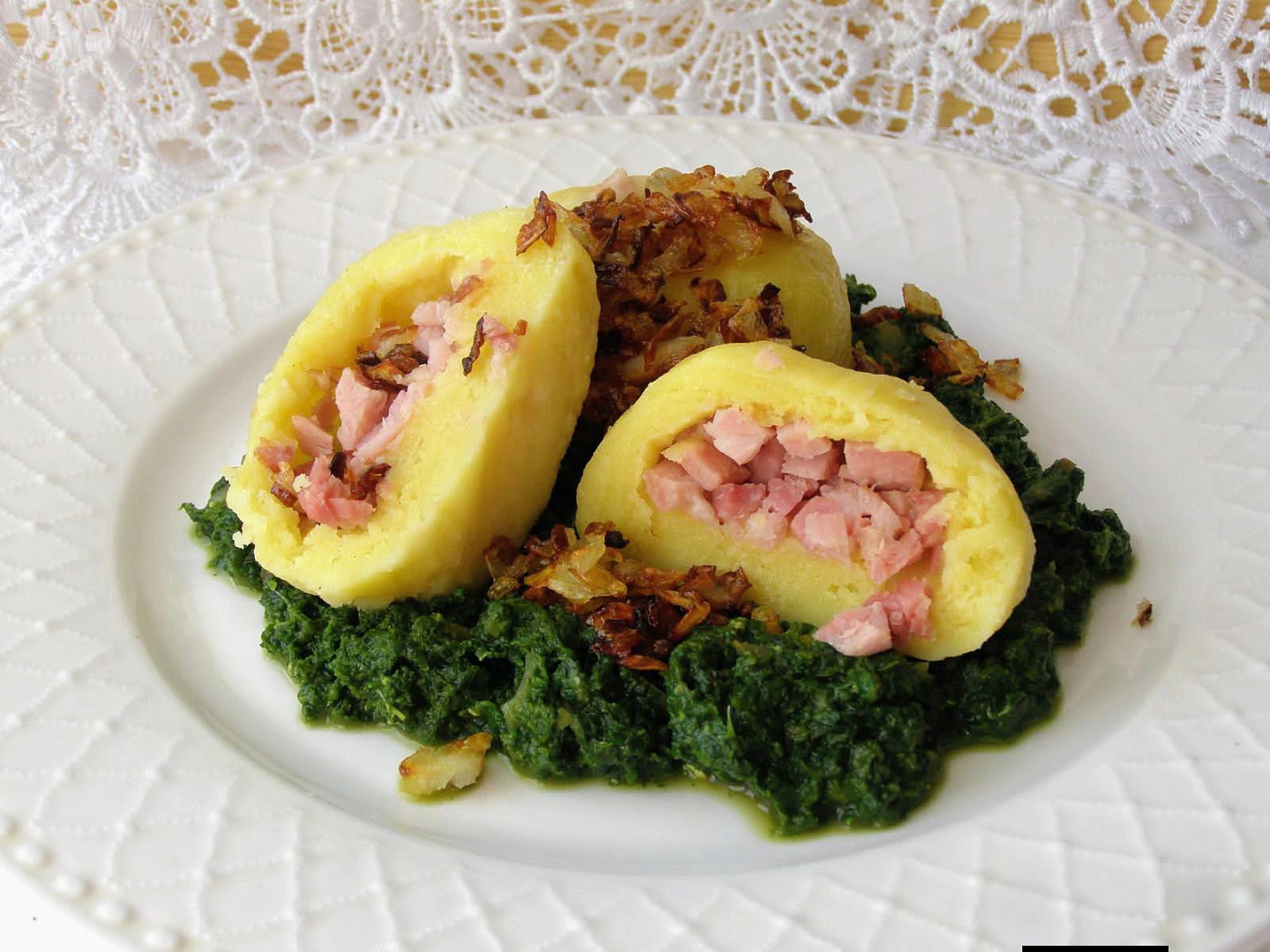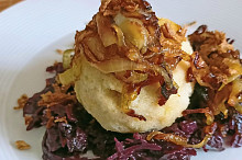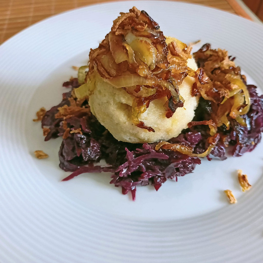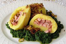 Bramborové knedlíky plněné uzeným masem a červené zelí s vínem