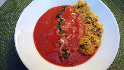 vodou tak, aby byla ponořená a přivedeme k varu. Při sníženém stupni tepla vaříme do změknutí. Přidáme prolisovaný česnek, zázvor a vše rozmixujeme do hladké konzistence Krok 2: Přilijeme smetanu, strouhneme 3x muškátový oříšek, necháme ještě prohřát. Podáváme polévku posypanou parmezánem, zelenou natí a přidáme parmezánové chipsy. Krok 3: Na chipsy předehřejeme troubu na 180 °C a plech vyložíme papírem na pečení. Parmezán nastrouháme část najemno na chipsy a menší část nahrubo na posyp. Jemně nastrouhaný parmezán lžičkou rozdělíme na papír na malé hromádky. Krok 4: Každou hromádku maličko posypeme oreganem, vložíme do trouby o jednu drážku pod prostřední a pečeme cca 4-5 minut (podle trouby). Když začnou chipsy zlátnout sundáme je s papírem a poté lehce zchladlé sloupneme. Jsou dobré i samotné.