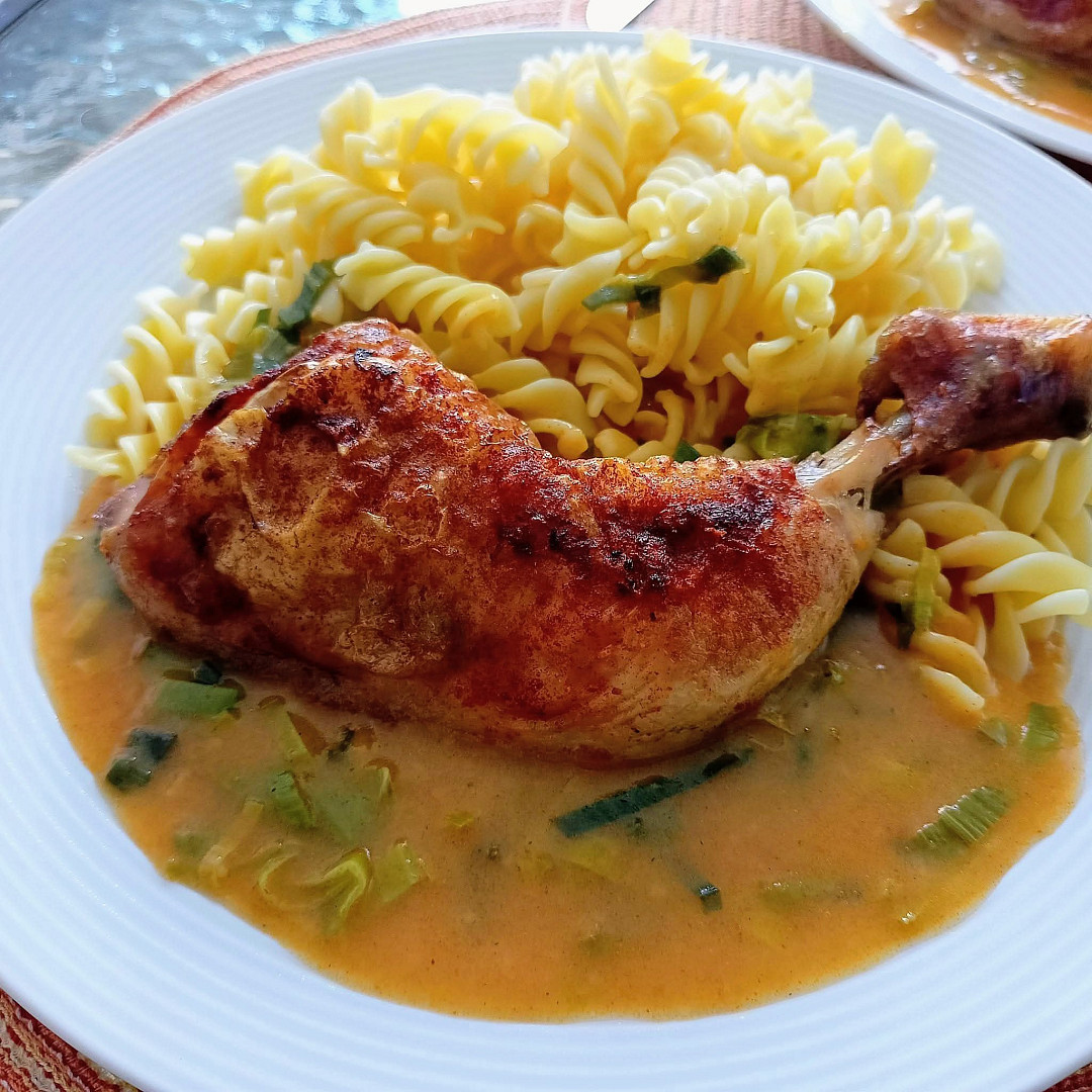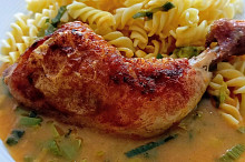 Kuřecí stehna na špeku a pórku