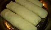 Krok 1: Uděláme těsto jako na bramborové knedlíky a z něj vytvoříme silnější placičky jakéhokoli tvaru (já dělám obdélníčky, tak, aby se tam přesně vešla slanina).
