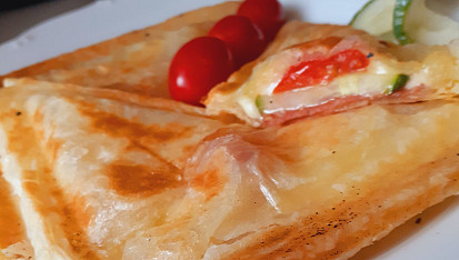 Krok 2: Na těsto rozložíme oblíbené náplně, do rohu každé plotýnky. Přiklopíme druhým plátem a pečeme v toustovači dozlatova.