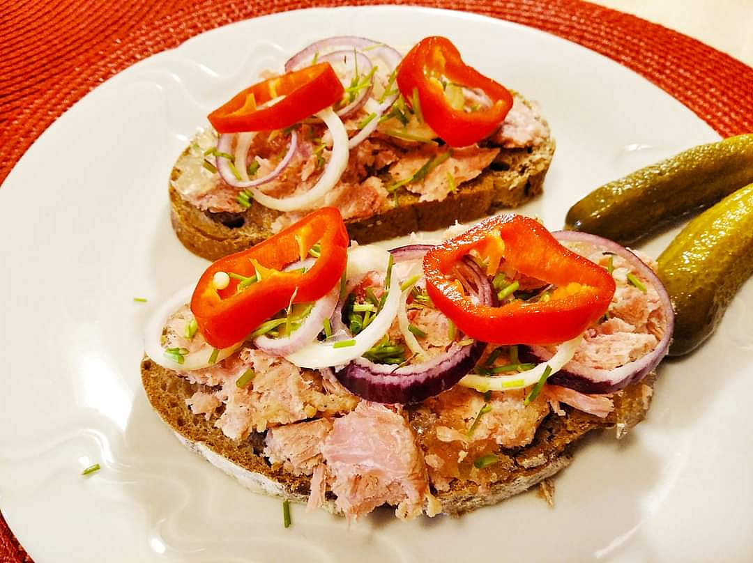Jednohubky s tresčími játry, červenou cibulí a řeřichou