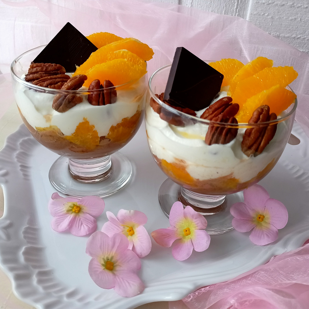Tento sladký dezert je na přípravu velmi jednoduchý a zároveň plný čokolády a pomerančů. Kysaná smetana dodá svěží chuť. Podáváme vychlazené, s pomerančem a pekanovými ořechy. Hodí se jako rychlý odpolední dezert a svačina pro děti.
