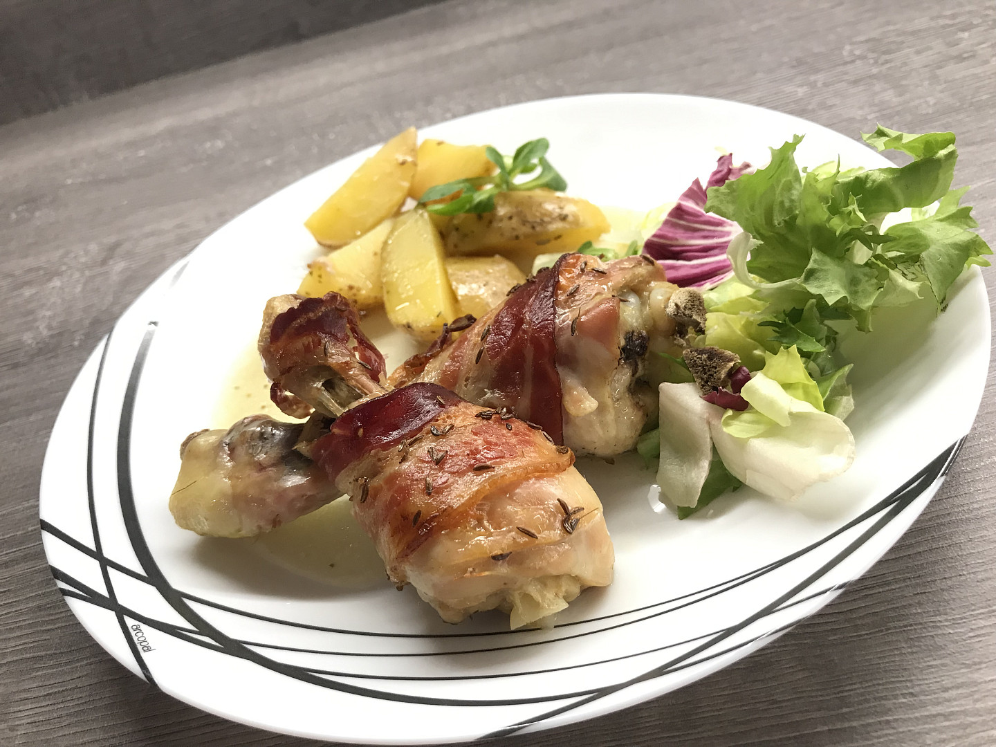 Kuřecí paličky obalené slaninou a pečené s bramborami