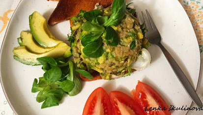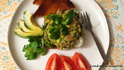 Vše smícháme v misce spolu s hořčicí, olejem, citronovou šťávou, dobře promícháme, případně dochutíme pepřem, je-li potřeba. Krok 3: Podávala jsem na topinkách spolu s listy mixu salátu, s listy polníčku a rajčaty.