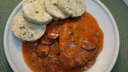 Okurky nakrájíme na kostičky, klobásku oloupeme a nakrájíme na tenká kolečka. Okurky i s trochou láku a klobásou přidáme k masu.Přivedeme k varu a snížíme stupně tepla na 2. Krok 3: Přiklopené dusíme cca 15-20 minut (do změknutí masa). Dle potřeby podléváme horkým vývarem nebo vodou. Není potřeba zahušťovat, omáčka je dostatečně zahuštěná moukou z obalení masa. Krok 4: Nakonec přilijeme smetanu, rozmíchanou v trošce omáčky, dochutíme solí a krátce povaříme. Podáváme s kynutým knedlíkem, hrníčkovým, malými kulatými knedlíčky, rýží nebo těstovinami podle chuti.