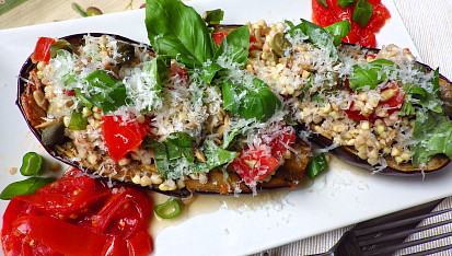 Krok 5: Na upečené lilky rozdělíme připravenou pohanku, poklademe kapary, bazalkou, jemně krájenou cibulkou i s natí a posypeme podle chuti semínky. Nakonec doplníme strouhaným parmazánem a pečenými rajčaty.