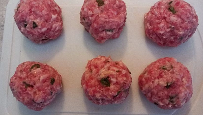 Krok 1: Očištěné jehněčí maso nameleme do misky. Přidáme sůl, kmín, 2 vejce, drcený bílý pepř, škrob a oprané, osušené a jemně nasekané lístky máty. Dobře promícháme a vlhkou rukou vytvoříme malé kuličky o průměru asi 4 cm. Z namíchaného masa vytvoříme velkou šišku, rozdělíme ji na 4 díly a z každého dílu pak vytvoříme 3 kuličky.