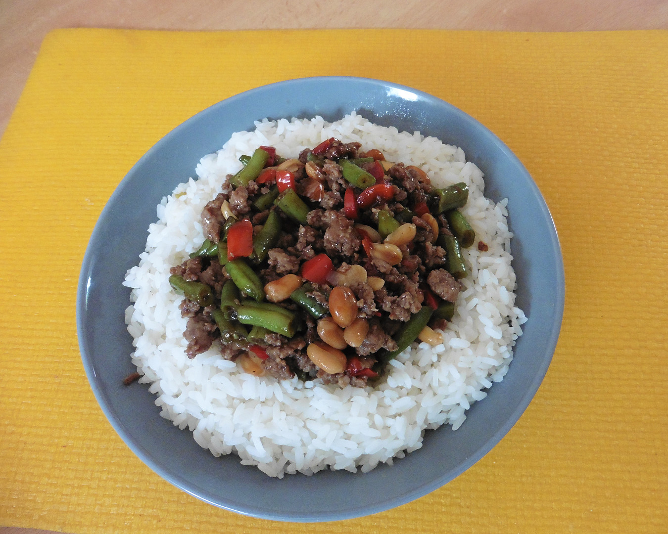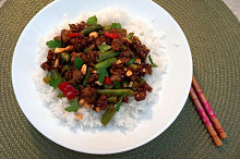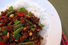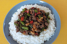 Stir-fry s mletým masem, zelenými fazolkami a červenou paprikou