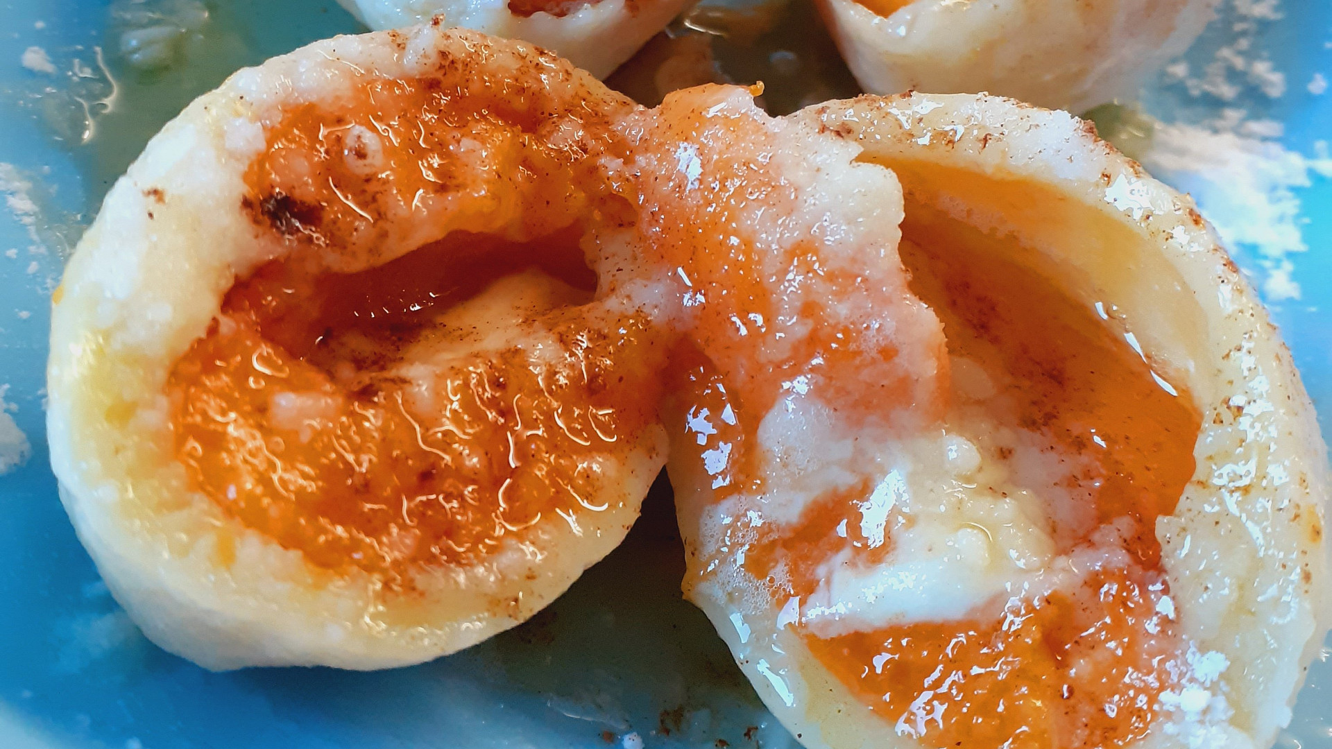 Ovocné knedlíky jsou zde ozvláštněny kostičkou bílé čokolády, která se vařením rozpustí a dodá meruňkám zvláštní sladkou příchuť. Je jen na vás, zda budete podávat se skořicí, tvarohem, opečenou strouhankou či kakaem.