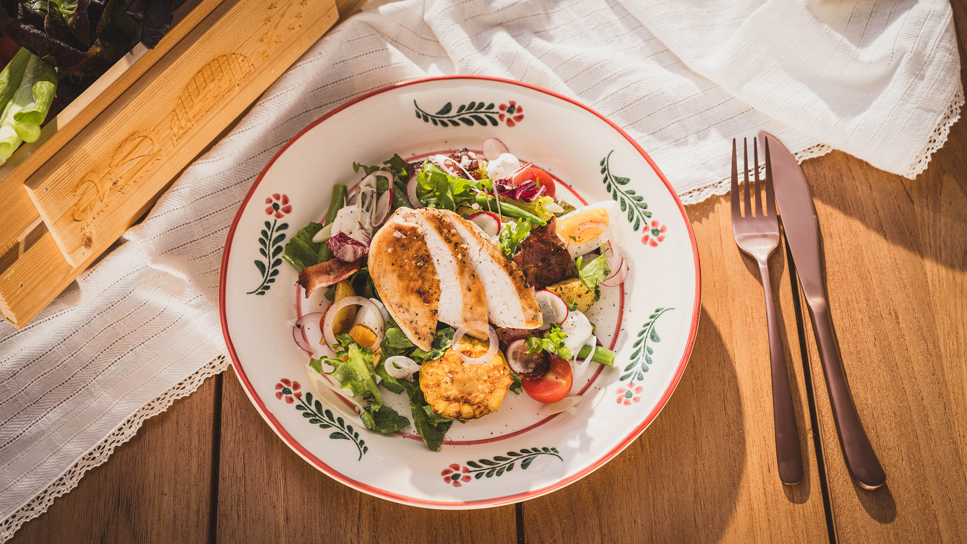 Saláty se v poslední době těší velké oblibě. Lehký salát s kuřecím masem, vejci, restovanou slaninou brambory a kukuřicí, lehce zakápnutý jablečným octem a olivovým olejem, poslouží jako sytá večeře nebo oběd do práce.