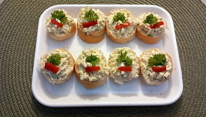 Krok 3: Vzniklou pomazánku nanášíme vidličkou do soudečků z rohlíků a dozdobíme kouskem červené papriky a petrželky.