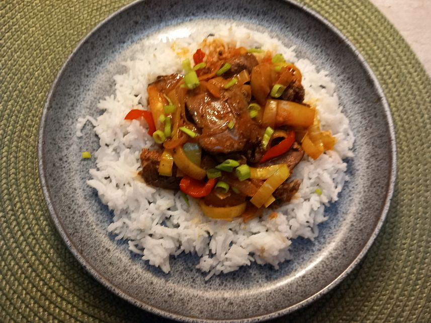 Paprikovou pastu jsem měla jen pálivou, takže celé jídlo bylo pikantnější než jsem čekala, ale chlapi byli spokojeni. Dali jsme si játra s bramborem, taky dobré. Děkuji za recept.