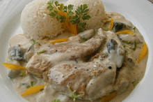 Vepřový plátek z krkovice na žampionech, zelenině a smetaně v papiňáku