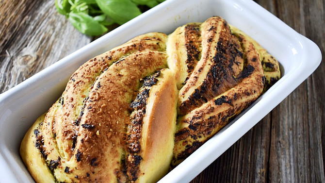 Pohostěte návštěvu zajímavě tvarovaným slaným copem. Na jeho upečení je třeba mít do trouby chlebíčkovou formu, ale když ho pak v ní nesete na stůl, vypadá opravdu nádherně. Na řezu se objeví zelené žilkování pestem a ta vůně, která se nese celým domem!