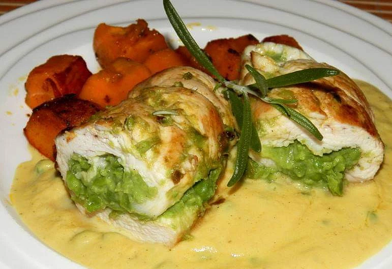 Kuřecí prsa plněná hráškem s pečenou dýní a kari omáčkou