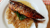 Makrela obsahuje mnoho zdraví prospěšných látek, proto by na našich stolech neměla chybět. Upečeme ji v pečence na cibulovém lůžku a k ochucení použijeme sušený česnek a kmín. Takto připravenou makrelu podáváme s pečivem a zeleninovým salátem.