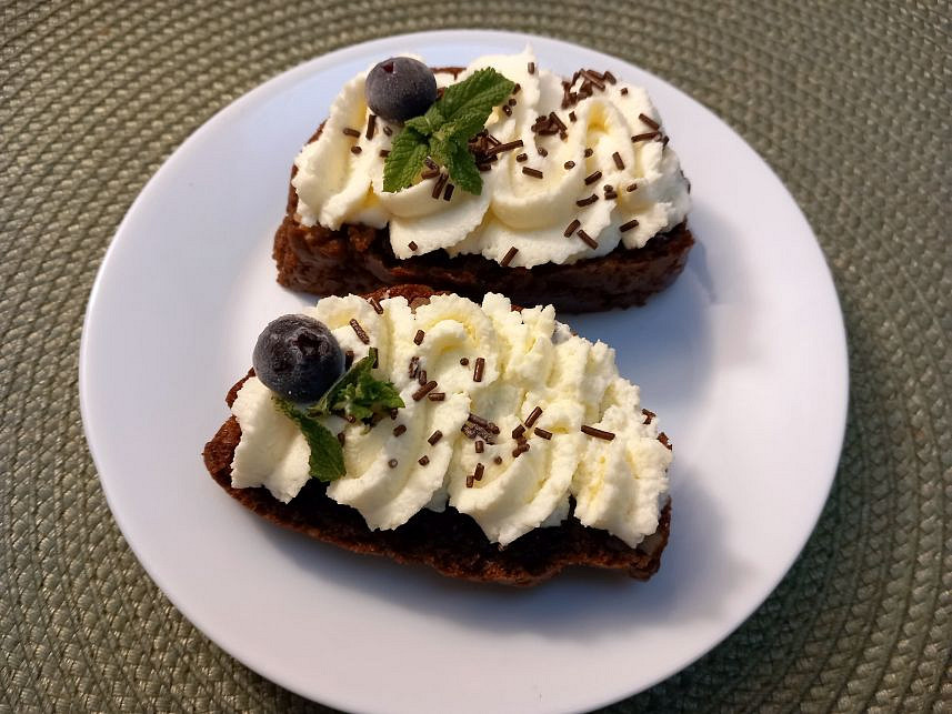 Ochutnejte lahodný dezert, který potěší milovníky čokolády a sladkých dobrot. Tento moučník, zdobený bohatou porcí šlehačky, kombinuje jemnou čokoládovou chuť s křupavými kousky ořechů a kandovaného ovoce.