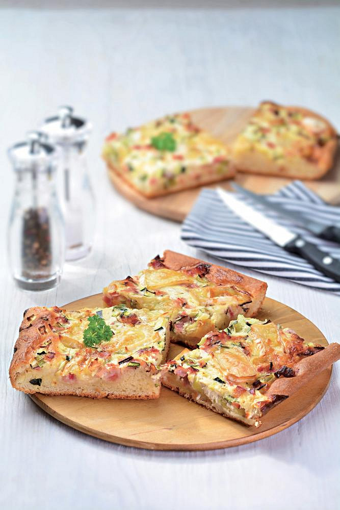 Slané koláče jsou chutné teplé i studené a skvěle se hodí jako svačina na cesty. Koláč připravíme z kynutého těsta a plníme náplní ze zakysané smetany, cukety, slaniny a jarní cibulky. Koláč poklademe hermelínem a můžeme péct.