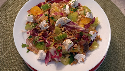 Tento osvěžující salát plný chutí a barev poslouží v horkých dnech jako lehký oběd. Díky bulguru totiž dostatečně zasytí. Salát podáváme s kozím sýrem, zasypaný opečenými slunečnicovými semínky a petrželovou natí.