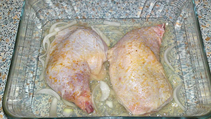 Krok 1: Kuřecí stehna opláchneme a osušíme. Potřeme česnekem utřeným se solí, posypeme mletým pepřem a skořicí.