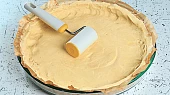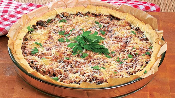 Krok 4: Pomocí válečku rozválíme těsto a vložíme do formy tak, aby vznikly vyvýšené okraje. Houbovou směs rozprostřeme na těsto, posypeme sýrem a pečeme asi 40 minut.