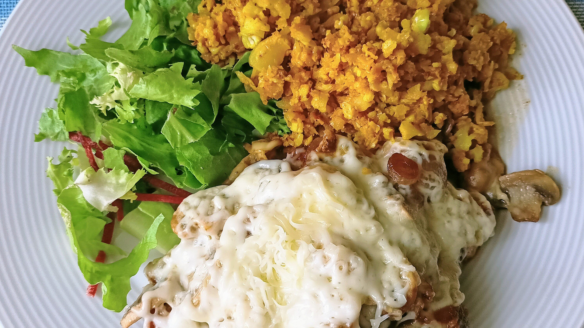 Vepřová kotleta se žampiony a sýrem, květáková rýže (vhodné i pro diabetiky)