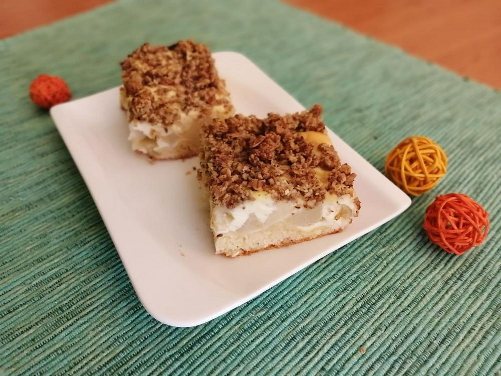 Tvarohová buchta s hruškami a ořechovou přikrývkou