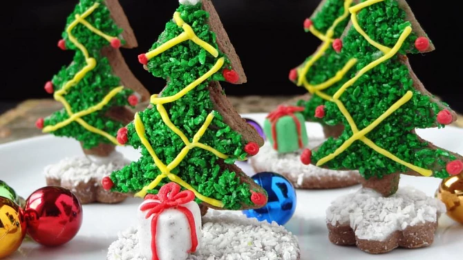 Krásně nazdobené vánoční stromečky z perníkového těsta ve sváteční výzdobě určitě nepřehlédnete. Díky rozmanité směsi koření pěkně voní. Ozdobte je citronovou polevou a barevným kokosem, přidat můžete i dárečky z fondánu.
