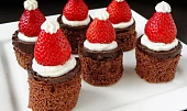 Krok 5: Jahodám odřízneme stopky, opláchneme je a osušíme. Na každý řez naneseme zdobičkou trochu tvarohového krému, do kterého vtiskneme připravenou jahodu. Vznikne tak dojem červené mikulášské čepice s bílým lemem. Na vrcholu jahody vytvoříme z tvarohu ještě malou bambulku a podáváme.