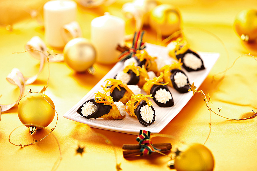 Krok 1: Máslo nakrájíme na malé kousky. Mouku nasypeme na vál a uprostřed uděláme důlek. Krok 2: Do důlku vložíme máslo, cukr a sůl. Vše důkladně promícháme. Přilijeme brandy a ocet. Krok 3: Směs ručně prohněteme do pevného, ale tažného těsta, které po důkladném propracování zabalíme do potravinářské fólie a necháme asi 30 minut odležet v ledničce. Krok 4: Pracovní plochu lehce posypeme moukou a těsto na ní vyválíme na tloušťku 2-3 mm. Rádýlkem vyřežeme čtverce o stranách 8 cm. Krok 5: Každé dva protilehlé rohy potřeme bílkem a čtverec jedním rohem namotáme na trubičku a natřeným bílkem spojíme k sobě. Trubičky vložíme do pánve s rozpáleným olejem a pečeme dozlatova. Přebytečný tuk osušíme papírovou utěrkou a trubičky necháme na mřížce vychladnout. Krok 6: Trubičky zčásti namáčíme v čokoládové polevě, kterou připravíme důkladným promícháním čokolády, másla a mléka v horké vodní lázni. Cukroví posypeme kandovaným ovocem nebo pomerančovou kůrou a necháme zaschnout. Krok 7: Náplň: ricottu smícháme s cukrem, skořicí a vanilkovým cukrem. Připraveným krémem plníme čokoládové trubičky.